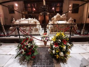 La ofrenda floral ha consistido en que cada asistente pudo aportar el ramo o flores que deseara, con las que se adornó la cancela que rodea los cenotafios de los Reyes Católicos y de su hija Doña Juana y su esposo Don Felipe.