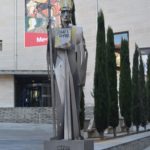 Me he acercado hasta el río y de pasada he saludado a la estatua del Abad Oliba, por supuesto decorada con lazos amarillos, que ni a los suyos respetan; ni al mismo Dios respetarían de pillarle en un descuido (bien distinto sería que el abad luciera un turbante…).