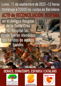 participará el próximo 11 de septiembre en un acto de reconciliación hispana coincidente con el aniversario de la históricamente tergiversada Diada de Cataluña. Invitamos a nuestros simpatizantes a acompañarnos en el acto que se celebrará en el Antiguo Hospital de la Santa Creu (Calle Hospital 56, Barcelona).