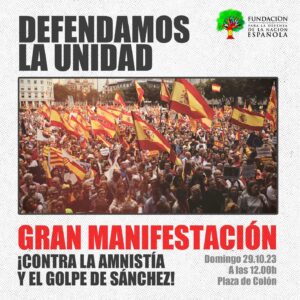 Ante la gravedad de la situación, la Fundación DENAES convoca a toda la sociedad civil y a los partidos políticos en la Plaza Colón de Madrid el domingo 29 de octubre para manifestarse frente a una maniobra que solo traerá división y enfrentamiento entre españoles.