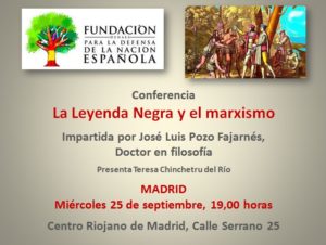 El próximo 25 de septiembre, José Luis Pozo Fajarnés, doctor en Filosofía, pronunciará la conferencia «La Leyenda Negra y el marxismo» en el Centro Riojano de Madrid a partir de las 19,00 h, presentado por Teresa Chinchetru del Río. La entrada es gratuita hasta completar aforo.