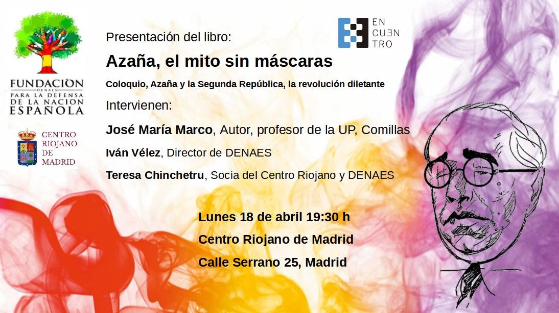 Presentación del libro de José María Marco, Azaña. Acopañarán al autor, Teresa Chinchetru e Iván Vélez. Asistencia libre hasta completar aforo.